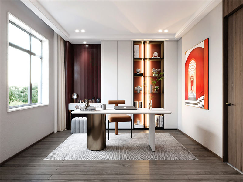 以白、深棕为主色调,简约造型的书桌搭配皮质座椅,暖光点缀的展示收纳柜兼具实用与美学。大窗引入充足自然光,既适配专注办公的需求,也能满足静心阅读的松弛时刻。