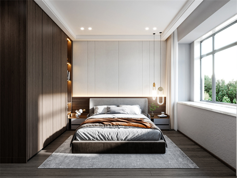 木色与暖灰营造温润静谧的氛围,大面积定制柜体满足衣物收纳需求,柔和床品搭配简约吊灯,让空间更显松弛。大窗引入通透自然光,无论是夜晚安眠还是晨起休憩,都能在简洁舒适的私域空间里,尽享放松的居家时光。