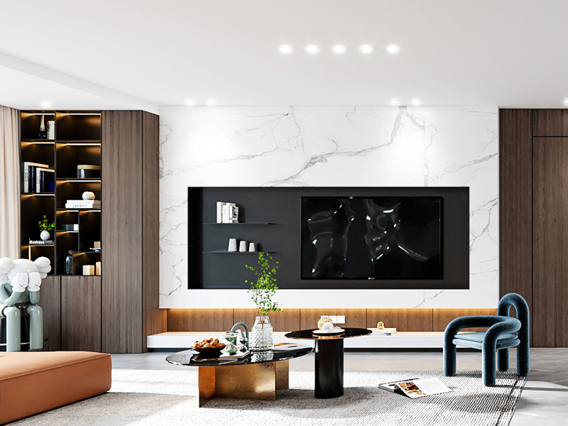 白、木色与金属色调相互交织,大理石纹理电视墙凸显时尚质感,简约柜体实现有序收纳,橙色、蓝色家具为空间注入活力。开阔的布局既适合家人围坐休闲,也能承载待客社交,于简约中传递出时尚与温馨的生活氛围。