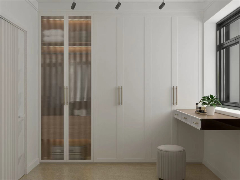 白色柜体结合木色细节,营造出整洁雅致的氛围。长虹玻璃门衣柜兼具收纳与展示,窗边小书桌满足轻办公或梳妆需求,小巧坐凳提升使用舒适度。整体空间将收纳与实用功能自然融合,适配日常整理衣物、静心工作的居家场景,尽显现代原木风的实用与美学平衡。