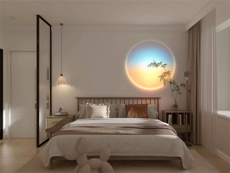 以原木色、暖白色为基调,原木床架搭配柔和床品,光影装置营造出日落般的温馨氛围。两侧原木床头柜实用且具自然质感,轻纱窗帘引入柔光,整体空间宁静舒缓,适配放松休憩的居家生活,尽显现代原木风的温润治愈。