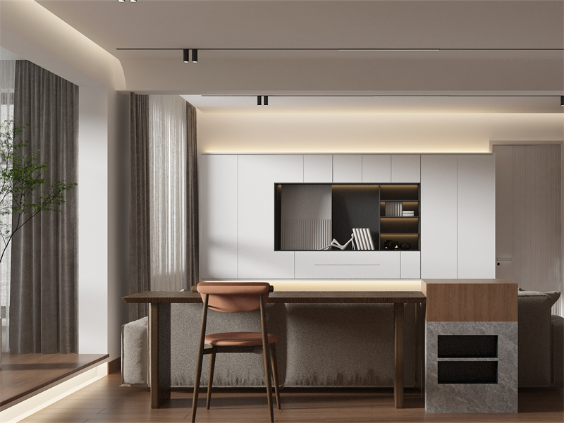 以木色、白色为主色调,简洁的柜体设计兼具收纳与展示功能,嵌入灯光增添层次感。木色与灰色软装搭配和谐,空间开阔通透,既适合日常休闲观影,也能作为家庭互动的核心区域,在现代原木风的简约布局中,传递出舒适放松的生活感。