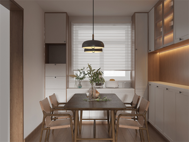 木色餐桌椅与暖白色柜体形成自然搭配,吊灯简约大方,百叶窗过滤后的光线柔和舒适。桌面绿植与餐边柜收纳兼顾美观与实用,日常家人围坐用餐或好友小聚,都能在这充满原木质感的空间里,感受温馨惬意的用餐氛围。