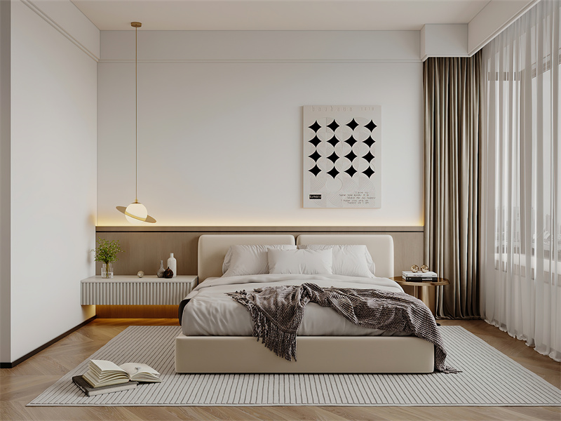 米白墙面与暖木色地板奠定柔和基调,极简床具搭配纹理床品,几何挂画与线性吊灯增添艺术氛围。大窗引入充足自然光,无论是夜晚安眠,还是晨起在床畔阅读放松,都能在简约纯粹的空间里,感受意式极简营造的静谧治愈私域。