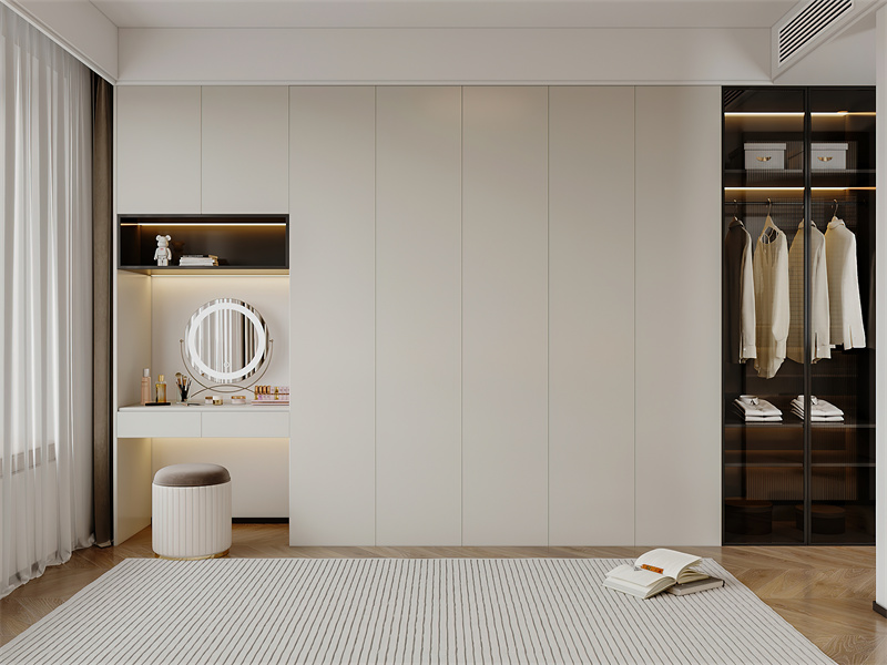 米白柜体结合黑框玻璃展示柜,嵌入灯光的开放格与梳妆台一体化设计,既满足衣物收纳的实用需求,又能便捷实现日常梳妆。简洁的造型与柔和的色调,让整理衣物、装扮的过程更显从容,体现意式极简对功能与美学的平衡把控。
