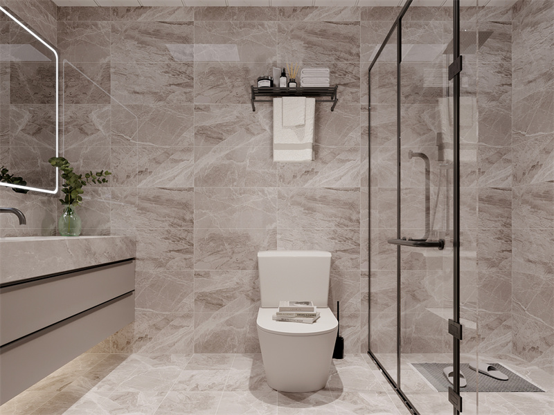 以浅咖大理石纹理瓷砖为主基调,黑白灰五金与绿植点缀其中,玻璃淋浴房划分空间,简洁金属置物架满足收纳。柔和的色彩搭配与利落的线条,让日常洗漱、沐浴的过程既实用又具质感,传递出现代风格的清爽与舒适。