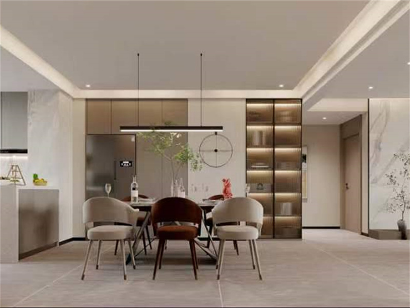 暖棕与米白为主色调,线性吊灯勾勒用餐区域,玻璃收纳柜搭配嵌入灯光,展现出精致的收纳与展示效果。不同色彩的餐椅形成层次,适合家庭日常用餐或小型聚会,在简洁造型与柔和光线下,提升用餐的仪式感与舒适感。