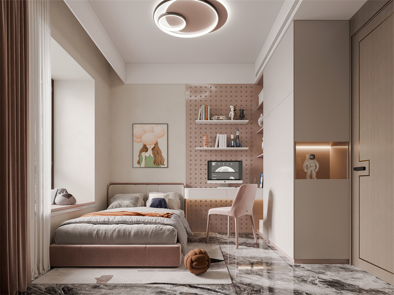 粉棕与浅米为主调,童趣挂画、宇航员摆件增添活泼感,睡眠区与学习区有序划分。日常休憩、学习时,温馨色彩与精致软装结合,既适配孩子成长需求,又传递出轻奢的细节质感。