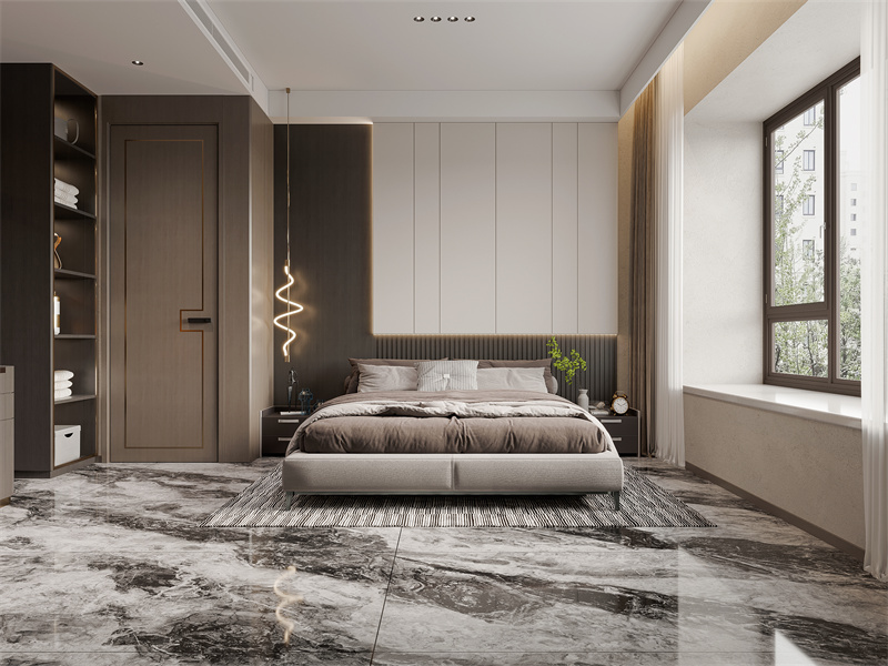 深棕、浅灰营造静谧氛围,线条简洁的床具搭配造型吊灯,大窗引入自然光线,充足收纳满足日常需求。休憩时,质感材质与柔和色调融合,打造出能卸下疲惫的轻奢睡眠私域。