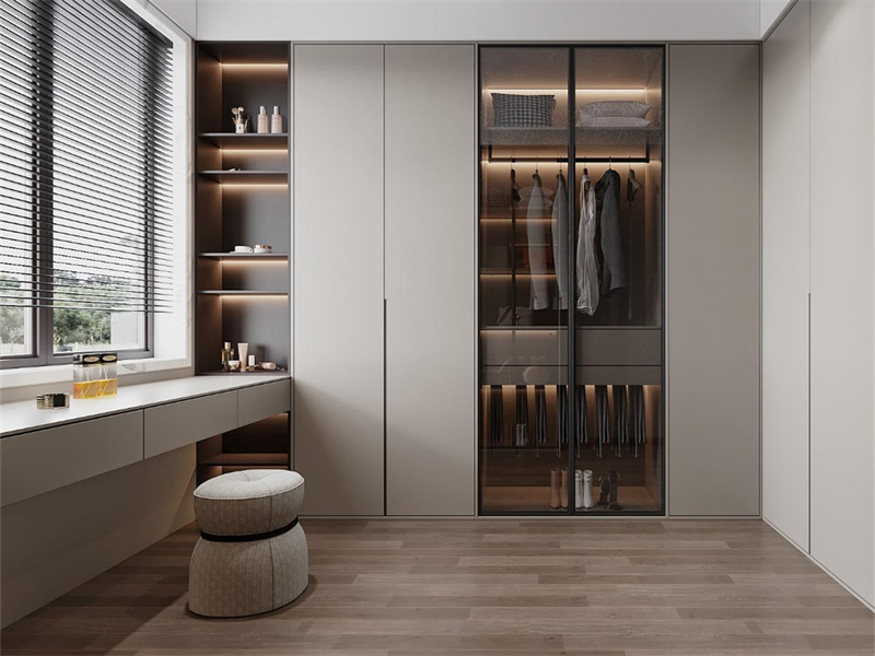 浅灰与木色营造出温馨氛围,玻璃柜体与封闭柜体结合,暖光巧妙勾勒出收纳区域层次。日常整理衣物、搭配穿搭时,有序的陈列与简洁设计,让穿搭准备有效率又具仪式感,契合精致的居家收纳需求。