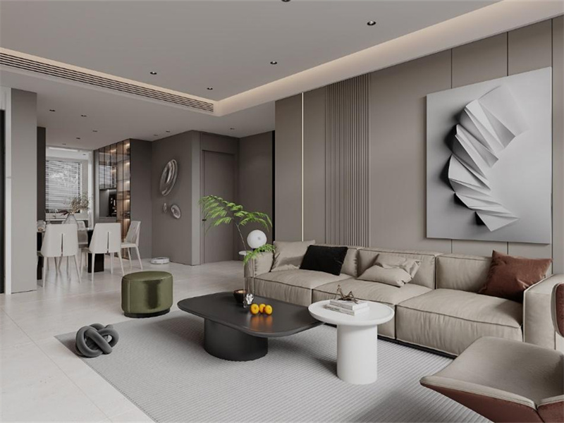 以浅灰为主色调,搭配线条简约的沙发与高低茶几,大幅艺术挂画提升格调。日常家人休闲互动或独处放松时,柔和色调与开阔布局,能让人尽享现代简约风的松弛感。