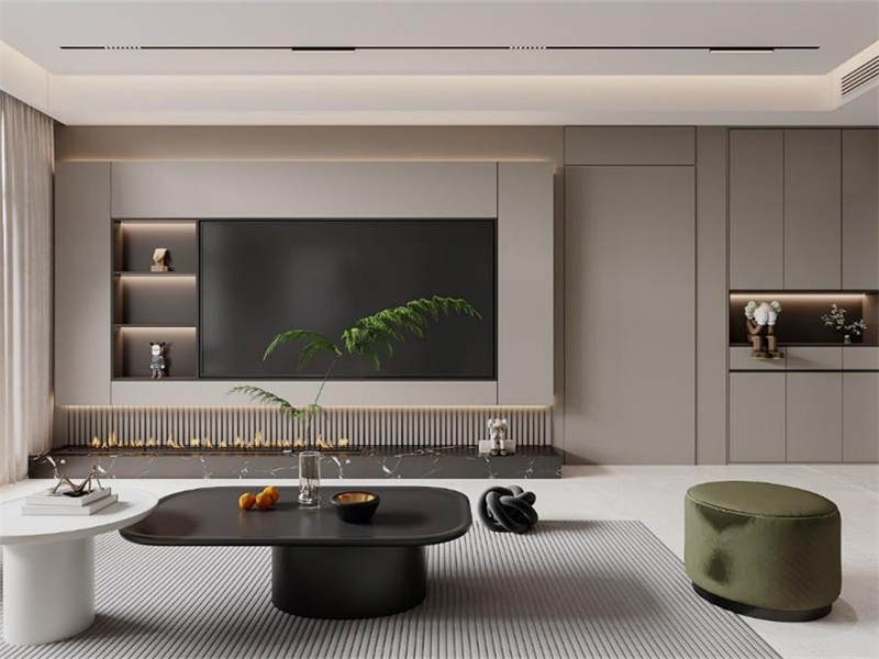 浅灰色背景墙简洁大气,嵌入式柜体搭配暖光,再辅以简约造型的茶几与绿植点缀。闲暇时观影休闲,利落的线条与柔和的光线,营造出舒适且有现代感的视听空间,让居家娱乐更惬意。