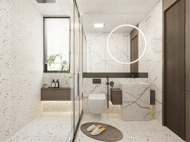 洗漱区采用独立式大理石台盆搭配环形镜灯,兼顾实用与精致。淋浴区用玻璃隔断实现干湿分离,搭配水磨石地面增加防滑性。壁龛收纳与悬浮柜,减少卫生死角的同时提升通透感。