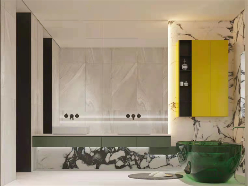 以浅调大理石作基底,撞色亮黄柜体与墨绿浴缸,跳脱色彩不杂乱。玻璃隔断保空间通透,嵌入式灯光衬材质质感,适配“泡澡放松”的生活方式,既显整洁利落,又能承载轻奢沐浴的惬意。