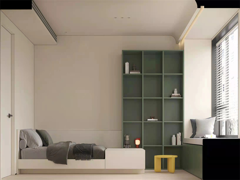 以现代风格为基调,色彩上用浅米白打底,搭配低饱和墨绿柜体与亮黄小凳,柔和中藏活力。柜体与床一体化设计,适配小空间“休憩+轻收纳” 的生活方式,柔光灯带晕开松弛感。