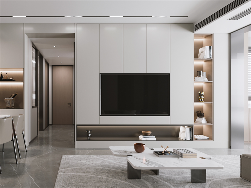以白、浅灰为主调,无主灯设计让光线均匀,整面收纳设计适配客厅的储物需求。整体以“去冗余”为核心,在整洁中透出品质与调性,多用材质与灯光强化简约感。
