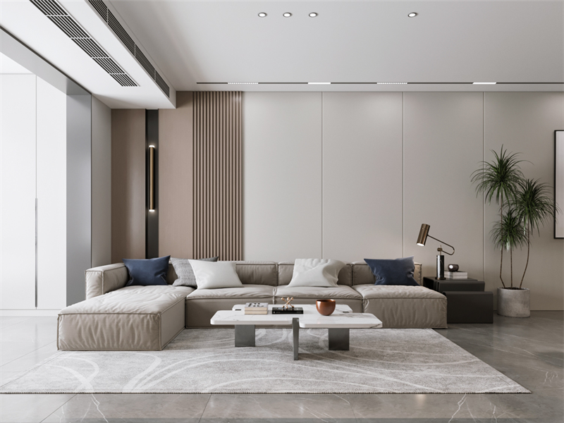 背景墙拼接肌理木栅与纯色墙,增加层次又不显杂乱。L型软包沙发+撞色抱枕,强化舒适质感。金属脚茶几+大型绿植,在简约中注入自然气息。