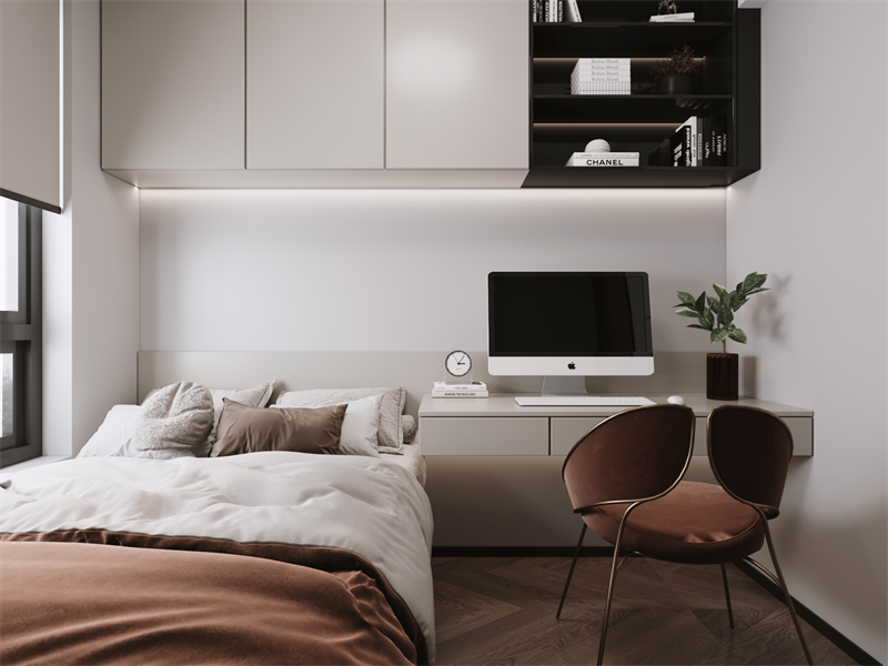 床与悬浮书桌衔接,兼顾休憩与办公。吊柜+嵌入式收纳架,更大化利用垂直空间。焦糖色丝绒椅搭配绿植与灯带点缀,弱化空间的功能性冰冷感。