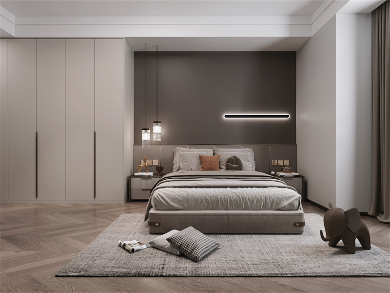 用材质层次营造静谧感,背景墙做深灰撞色、内嵌线性灯,弱化空间单调提升层次。整面无把手衣柜延伸视觉,搭配软包床体,强化舒适质感,木地板与肌理地毯,平衡温度。