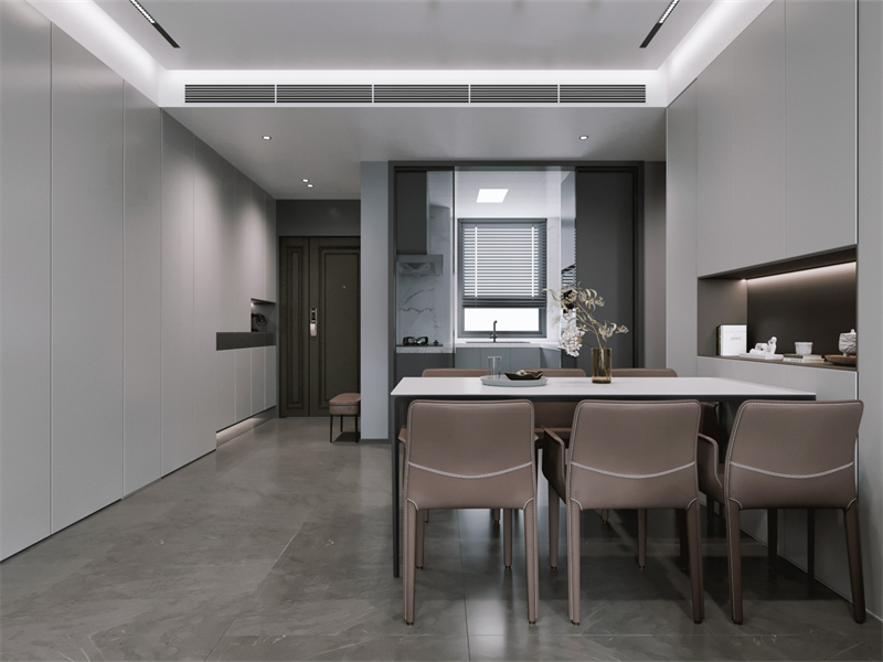 以浅灰与暖棕为主调,通过去边界化设计提升通透感,整面柜与墙面一体化衔接,弱化空间分割。餐桌选浅白台面+暖棕座椅,在冷调基底中注入温柔质感。