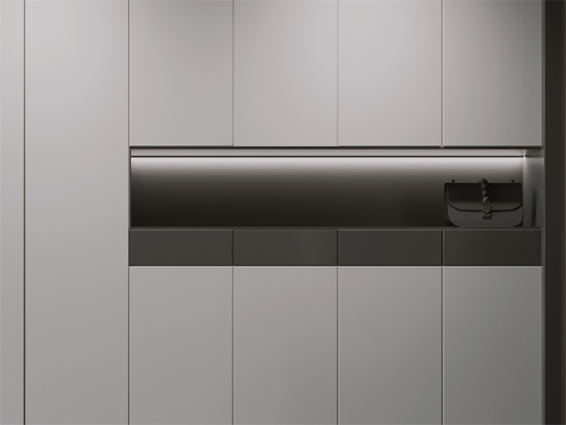 以浅灰+深灰,通过隐藏式逻辑强化整洁感整面柜采用同色无把手设计,弱化柜体存在感。中间嵌入深灰质感的置物区与功能区,兼顾实用与视觉层次。
