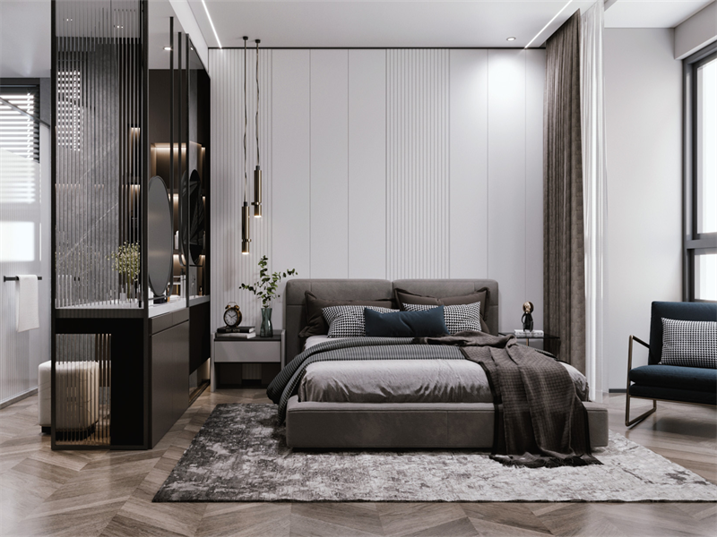 背景墙做竖向肌理木栅,搭配无主灯与线性灯,强化空间层次。玻璃隔断划分区域,既通透又保留隐私,整体材质搭配适配卧室的静谧与轻奢需求。