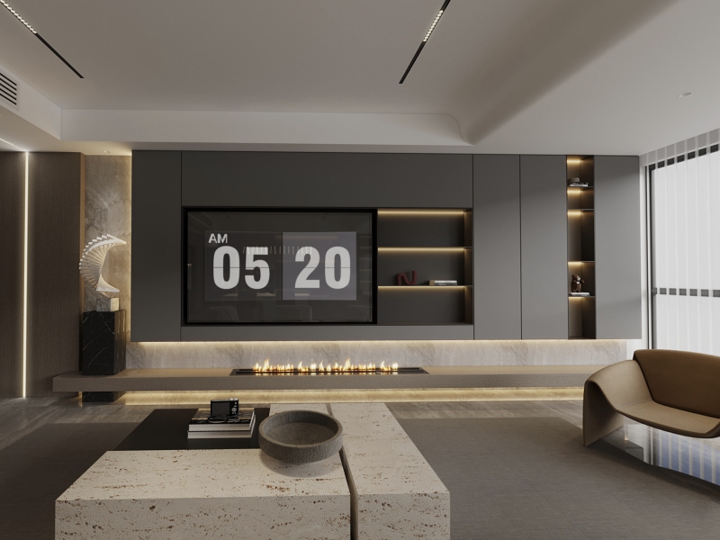 运用材质组合调配出空间情绪,弧形沙发以柔和曲线弱化硬朗线条。暗藏式灯带与点光源形成层级照明,既满足功能需求,又通过光影强化材质肌理,适配现代快节奏与温馨日常生活的多元生活场景。