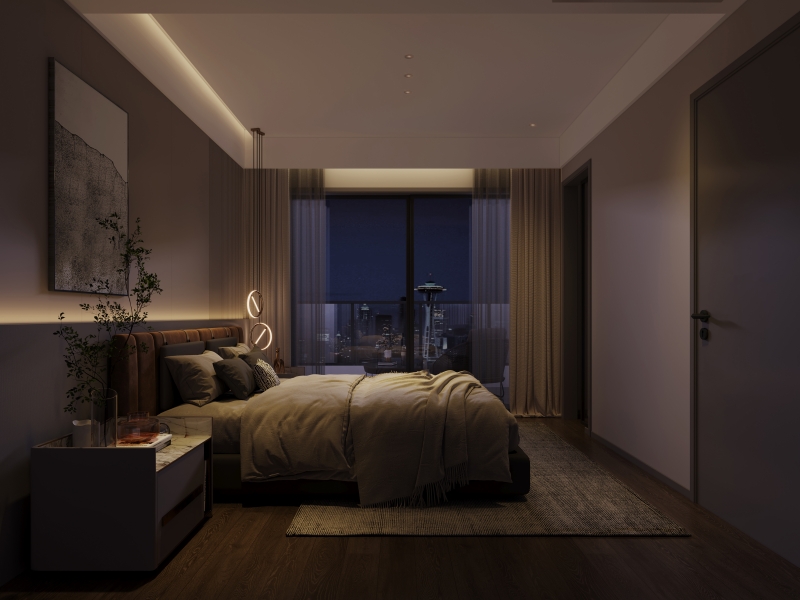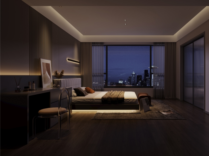以暖棕为主色调,搭配低饱和灰调软装,通过 “绒面床具 + 金属灯具” 的材质碰撞,契合意式轻奢的细腻质感。暗藏式顶光与局部氛围灯构建松弛照明系统,大窗引入城市景观,适配都市人群 “沉浸式休憩 + 私域疗愈” 的生活诉求。