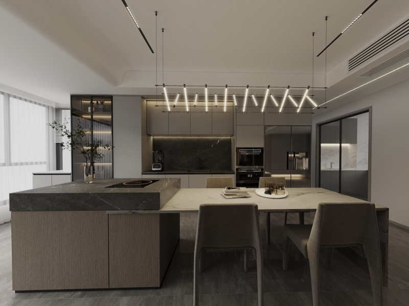 以深灰石纹中岛为视觉锚点,结合浅棕肌理柜面,通过石材与布艺间的材质对比,平衡意式轻奢的精致与温度。线性吊灯以几何形态强化现代感,开放式布局实现餐厨互动,适配现代人群 “社交型烹饪 + 仪式感用餐” 的生活需求。