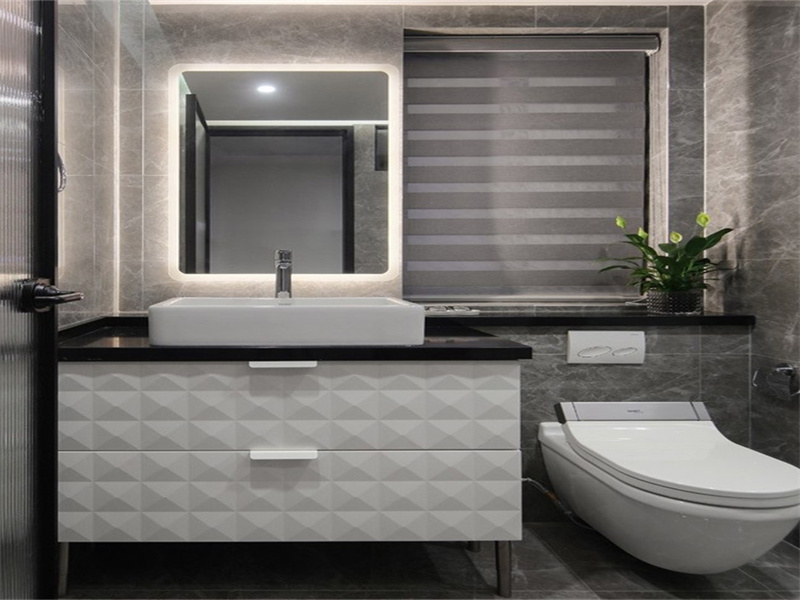 以深浅灰为基底,搭白色几何纹理柜面做层次,色彩克制统一。适配“效率整洁洗漱”的生活方式:镜柜柔光灯带弱化冷感,利落收纳藏起杂物,让日常洗漱既显简约质感,又保便捷舒适。