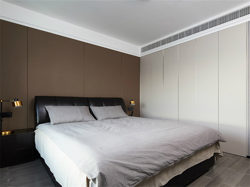 以棕褐+灰白为柔调基底,缀黑金细节提质感,色彩柔和统一。适配“静谧休憩”的生活方式:一体化收纳藏起冗余,软装配色协调柔和,让睡眠空间既显简约整洁,又裹着松弛舒适的休憩氛围。