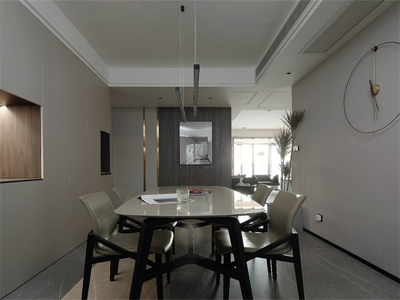以浅灰为底,衬木色肌理与黑金细节调合层次,色彩低饱和且有序。适配“轻聚餐+日常用餐”的生活方式:隐形收纳简化视觉,简洁桌椅让用餐场景利落无冗余,裹着简约舒适的日常氛围。