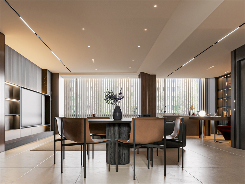 以暖棕+雅黑为基底,浅米地面衬通透,色彩沉稳有序。适配“轻聚餐+日常用餐”的生活方式:利落桌椅简化视觉,通顶灯光裹氛围,隐形收纳藏杂物,让用餐场景既显轻奢精致,又保日常舒适自在。
