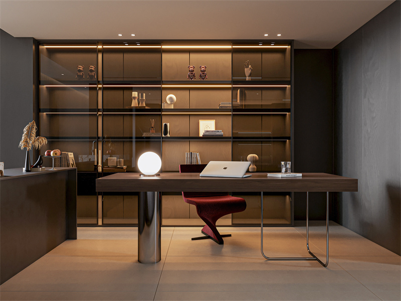以深棕+雅黑为底,酒红座椅点睛,色彩优雅有层次。适配“专注办公+藏品展示”的生活方式:玻璃收纳柜显精致质感,氛围灯衬格调,利落书桌保效率,让办公场景既显轻奢精致,又能承载专注与展示的双重需求。