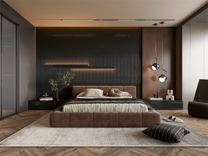 以深褐肌理墙+暖棕软包为基底,浅调软装调层次,色彩沉稳柔和。适配“静谧休憩”的生活方式:嵌入式收纳藏起冗余,柔光灯带筑松弛氛围,软包床具衬舒适,让睡眠空间既显轻奢质感,又裹满休憩的松弛感。