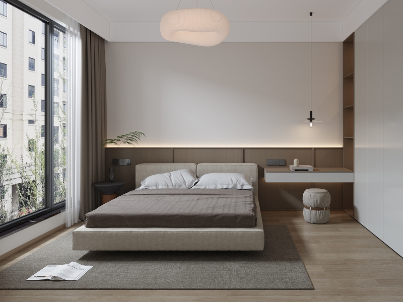 采用 “奶白墙面 + 浅棕床具” 的同色系渐变,通过绒面肌理与木质触感的碰撞,强化奶油风的细腻质感。悬浮书桌整合收纳与轻办公功能,分层照明系统(顶光 + 氛围灯)适配休憩与阅读场景,大窗引入自然光线,契合现代人对于舒适与放松的追求 。