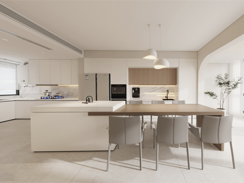 用奶白柜体搭配浅木色台面,通过色彩的饱和度平衡奶油风的温柔与实用。中岛整合烹饪与用餐功能,弧形门洞柔化空间边界,嵌入式照明强化操作区实用性,适配互动式的三餐生活方式。