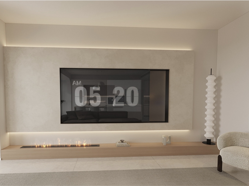 以奶白肌理墙为基底,搭配浅木色地台,通过材质间的组合,锚定现代奶油风的温柔基调。暗藏式灯带与壁炉元素构建情绪场域,波纹落地灯以曲线柔化空间,适配 “独处放空 + 轻量社交” 的生活场景,用低饱和色调包裹松弛感。
