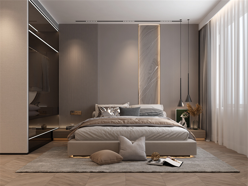 本案以浅灰、浅褐为温润基底,暖棕、藏青软装点睛,奢感与松弛兼具。客厅借艺术灯筑休闲社交场,卧室凭柔光裹休憩静谧,衣帽间以利落收纳理穿搭秩序,卫生间用大理石衬卫浴舒适。全居以嵌入式设计藏冗余,凭质感软装串起各场景,既显轻奢精致,又满裹日常松弛。
