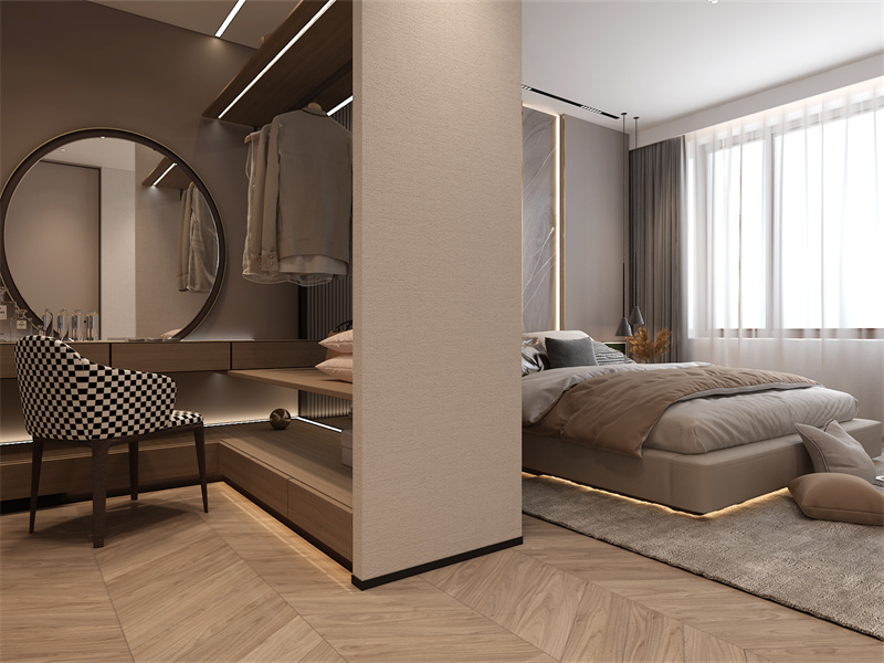 空间设计巧妙,用隔断划分出梳妆、更衣与睡眠区。居家时,晨起可在梳妆区从容打扮,转身取衣。色彩以大地色系为主,温暖沉稳。整体线条利落,家具简约实用,营造出舒适且具品质感的休憩空间,满足日常起居的多样需求。