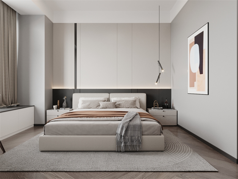 柔简静谧风卧室,浅米为主调,用材质层次营造松弛感。背景墙做肌理木栅与纯色拼接,搭配内嵌灯带,弱化空间单调,在浅调中注入温暖细节。
