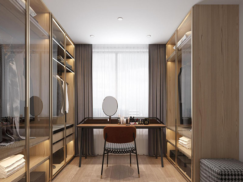 以暖木色柜体为核心,玻璃门显通透,暖光衬出整洁感,少量亮色软装提亮氛围。适配日常梳妆、衣物收纳的场景,功能分区清晰,木色的温和让整理衣物的过程更舒缓,实用与舒适在原木调里自然共生。