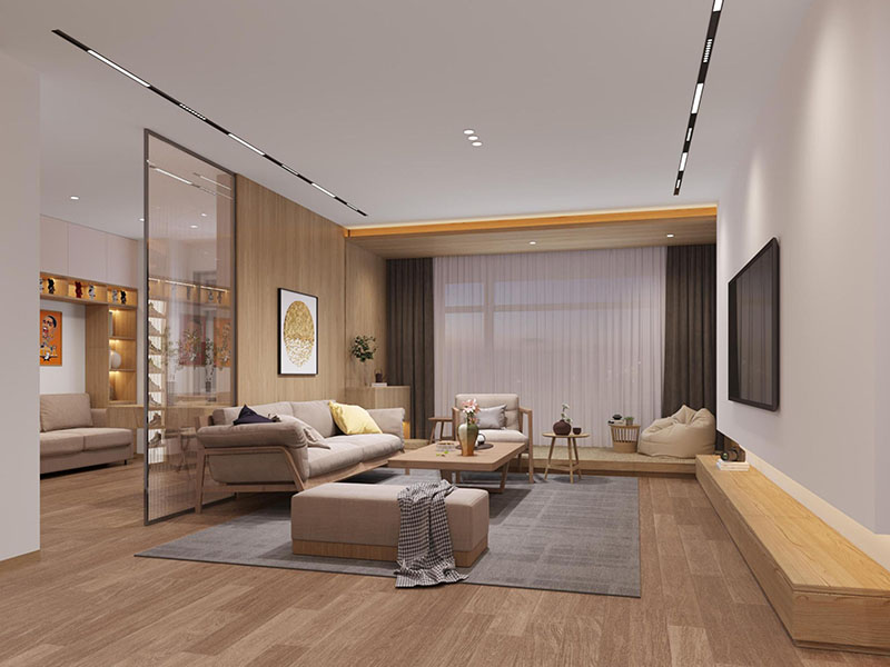 以暖木色为基底,搭配浅灰、米色软装柔化氛围,玻璃隔断既保通透又分区域。空间适配家庭闲坐、好友轻聚的松弛场景,木色的温暖裹满日常,利落线条+柔和色彩,让原木风的舒适落位每一处休闲时刻。