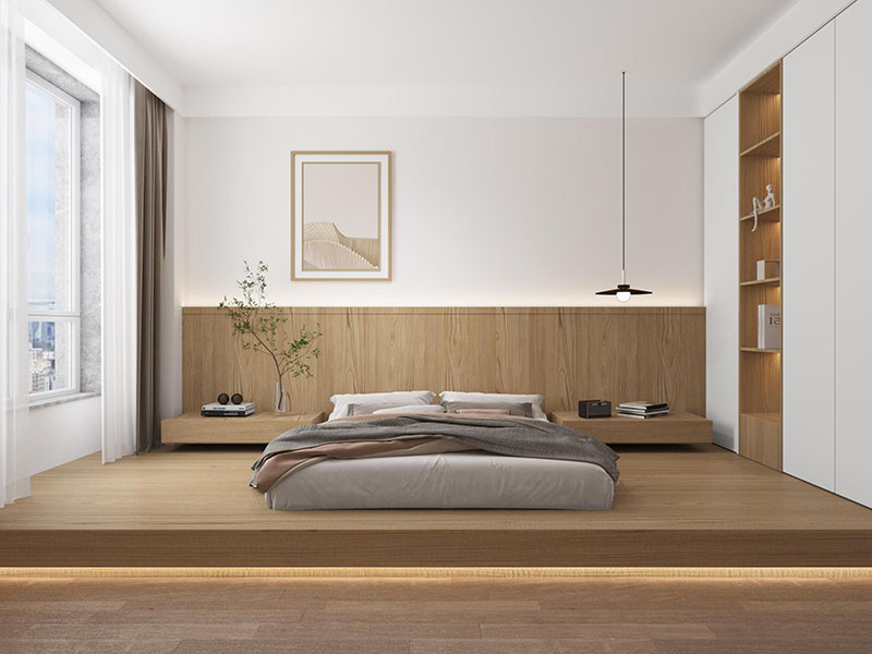 以暖木色地台+柜体定调,搭配白、浅棕软装,暖光勾勒静谧氛围。适配深度休憩的生活场景,嵌入式收纳藏尽冗杂,木色的温润中和浅调的轻透,让空间剥离纷扰,每一次躺卧都能卸下疲惫,是专属于休憩的松弛场域。