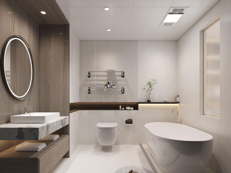 以暖木色+白+浅灰为调,大理石台面点缀质感,暖光柔化冷感。适配洗漱、泡澡放松的生活场景,木色的温暖中和卫浴空间的清冷,让日常洗漱也能有松弛感,原木风的舒适在此延伸至每一个生活细节。