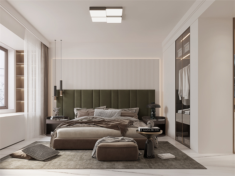 以浅棕、墨绿为色彩主调,绒面床头+线条背景墙显质感,嵌入式灯带衬静谧氛围。适配深度休憩、睡前放松的生活方式,柔和色调与现代细节结合,让私享空间既具简约格调,又裹满松弛舒适的休憩感。
