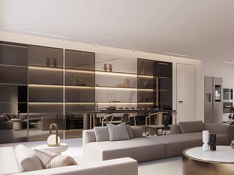 以浅灰、米白为基底,搭配金属、大理石材质提质感,嵌入式灯带衬出松弛氛围。空间适配日常品茶、好友轻聚的生活场景,低饱和色彩裹满精致感,让休闲时刻兼具现代简约的利落与舒适。