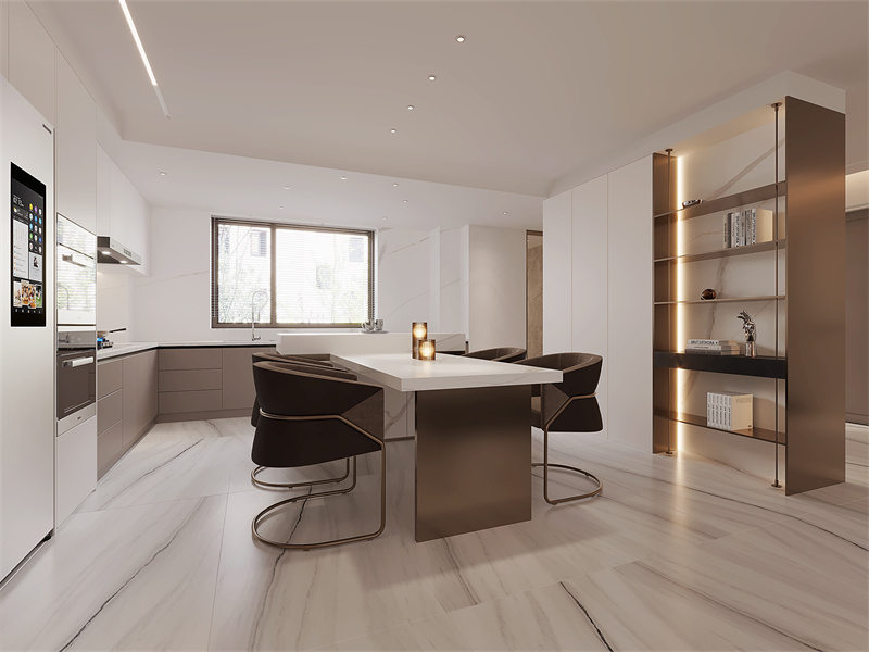 以白、浅灰为底,深棕座椅+金属细节点睛,简洁柜体藏收纳。适配日常烹饪、轻食聚餐的生活场景,低饱和色彩让餐厨空间既显现代利落,又能在烟火气里保持整洁舒适的质感。
