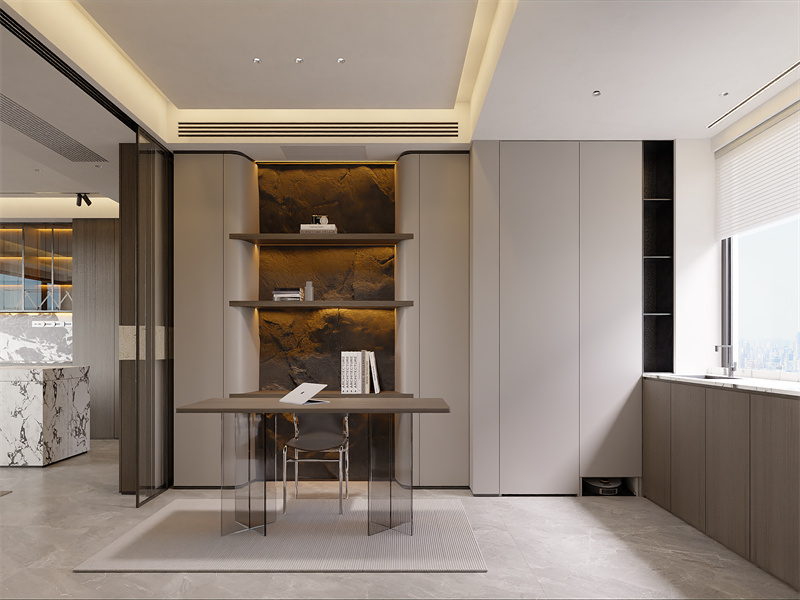 以浅灰+木色为基调,石纹背景墙衬出简洁质感,开放式置物架嵌收纳,简约书桌拓出实用空间。布局上通透无冗余,适配办公阅读的生活场景,柔和色彩+利落线条,让专注时刻兼具舒适与简约格调。