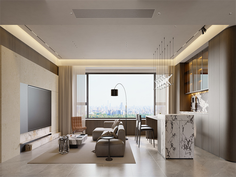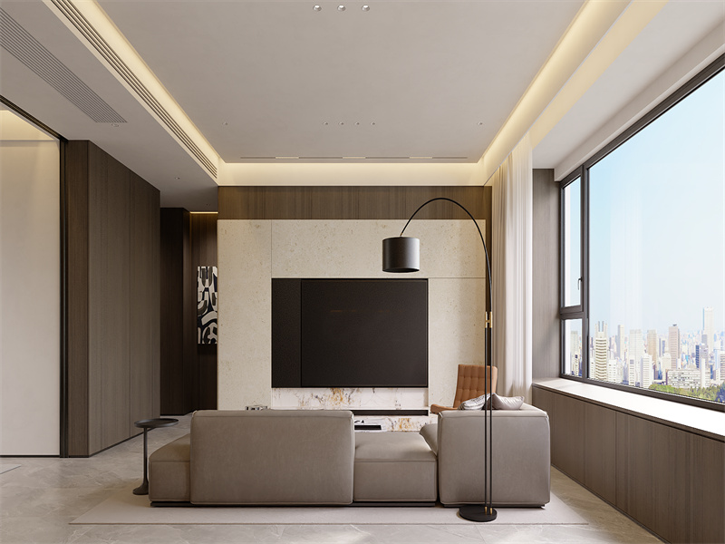 以浅石纹+木色为基底,简洁墙面嵌隐形式收纳,布局上沙发区与观景窗联动。适配观影休闲的生活场景,柔和色彩+利落线条,大窗引城市景致入室,让休闲时刻既舒适又具简约质感。